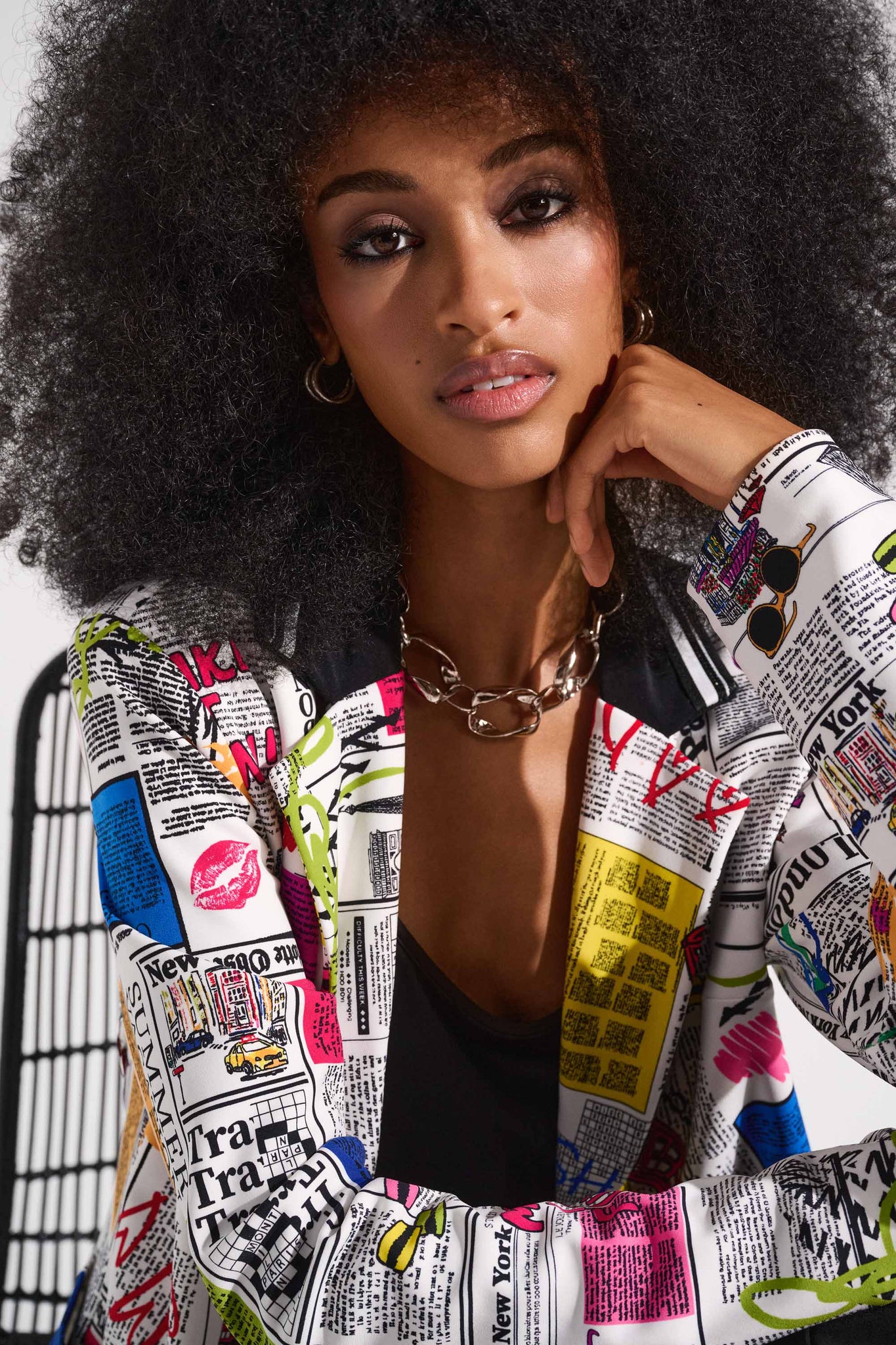Adorn yourself in chic contemporary style with this silky knit blazer. The piece is beautifully tailored in a slightly fitted design that complements any silhouette. An alluring word print covers the garment, lending it a unique appeal. The notched collar elevates the piece’s refined look with contrasting tape trim and tiny rhinestone accents.