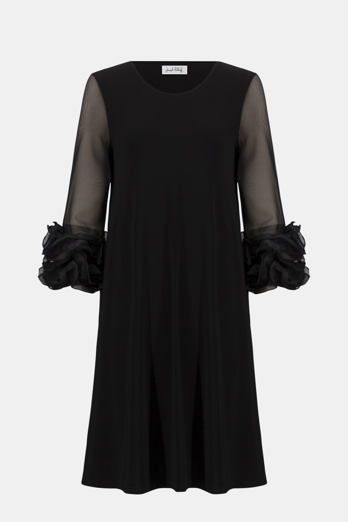 Silky Knit and Mesh A-Line Dress With Ruffled Trim. Feminine and flowy, this trapeze dress blends silky knit and mesh for soft structure. Featuring a scoop neckline, three-quarter bell sleeves trimmed with ruffles, and in seam pockets for a functional finish.