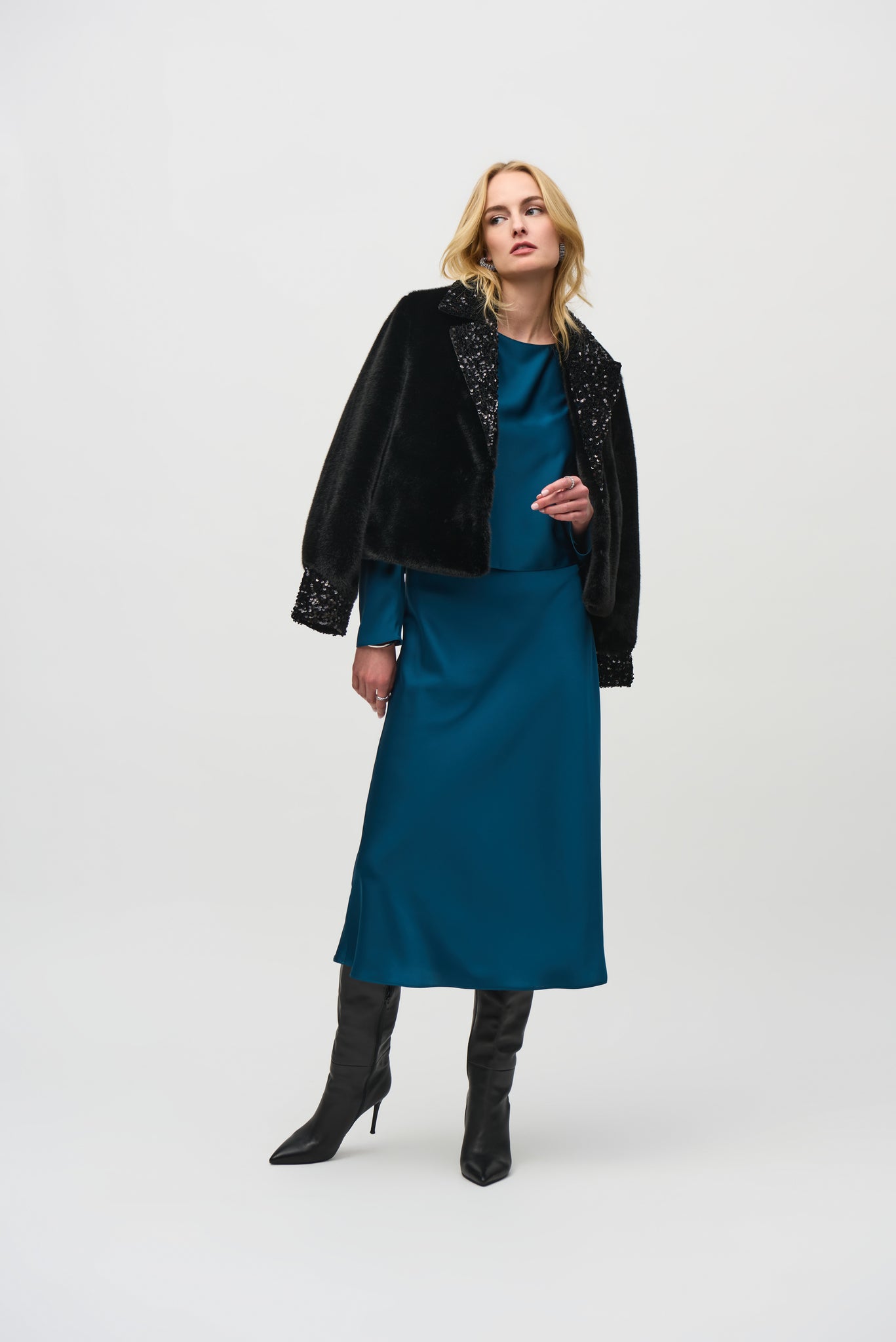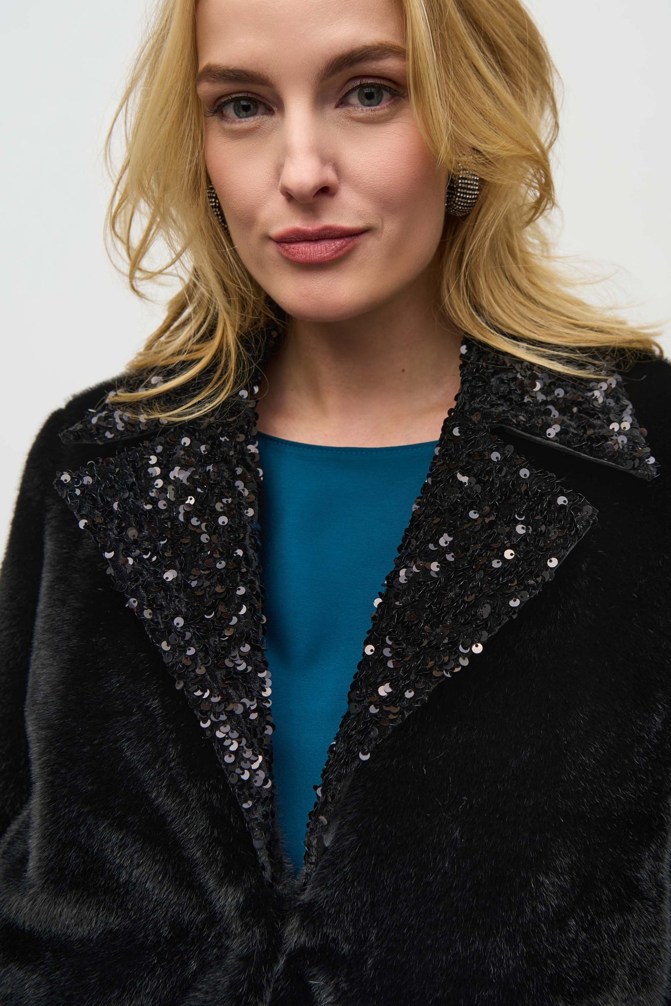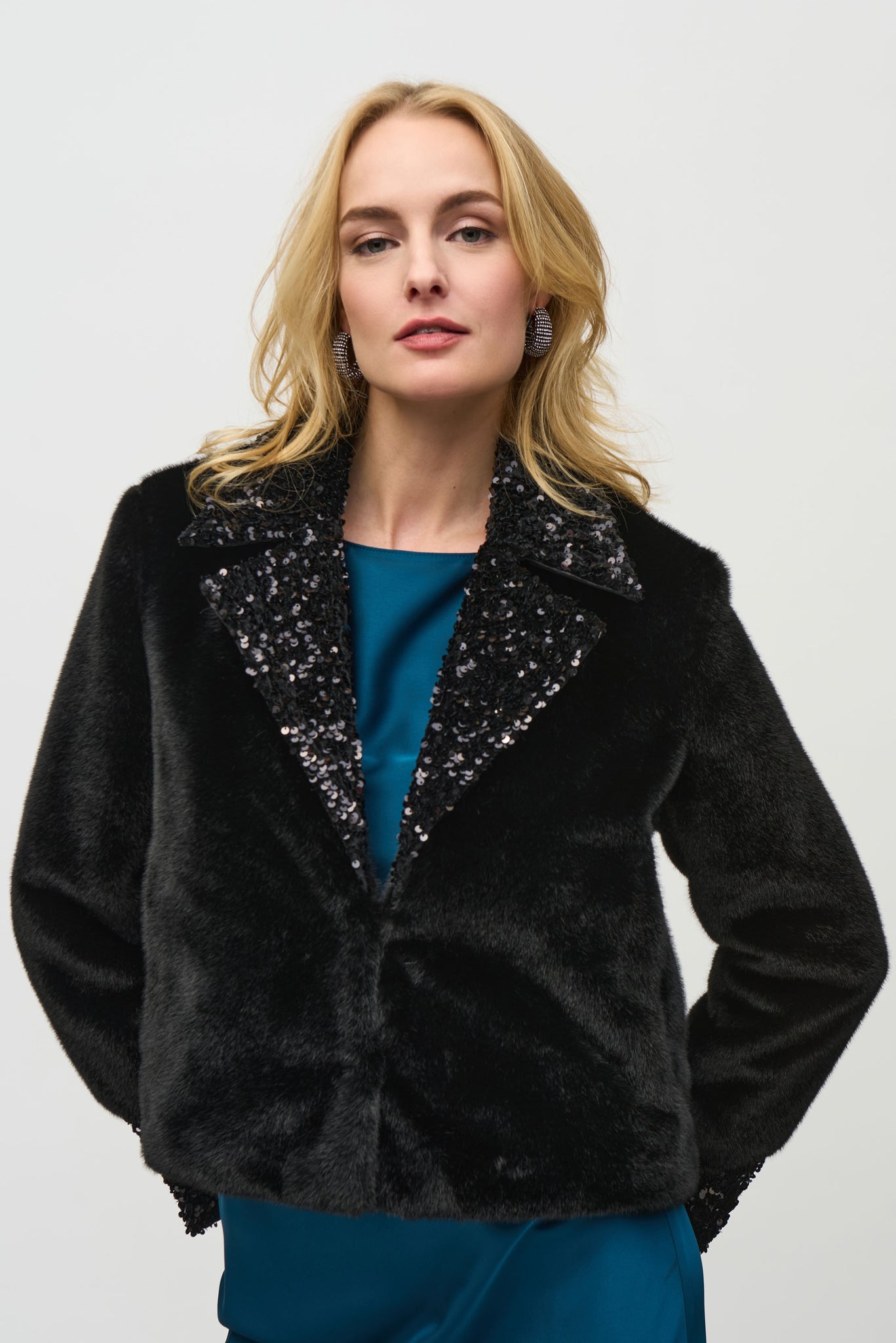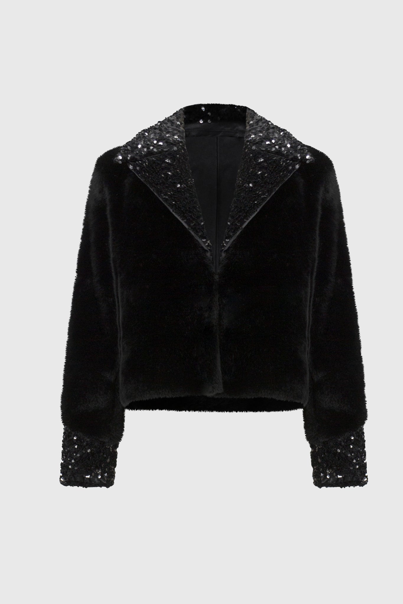 This jacket exquisitely crafted from sumptuous faux fur, presents a distinctively boxy silhouette. A sophisticated notched collar and bold sequin trim give it a unique personality.