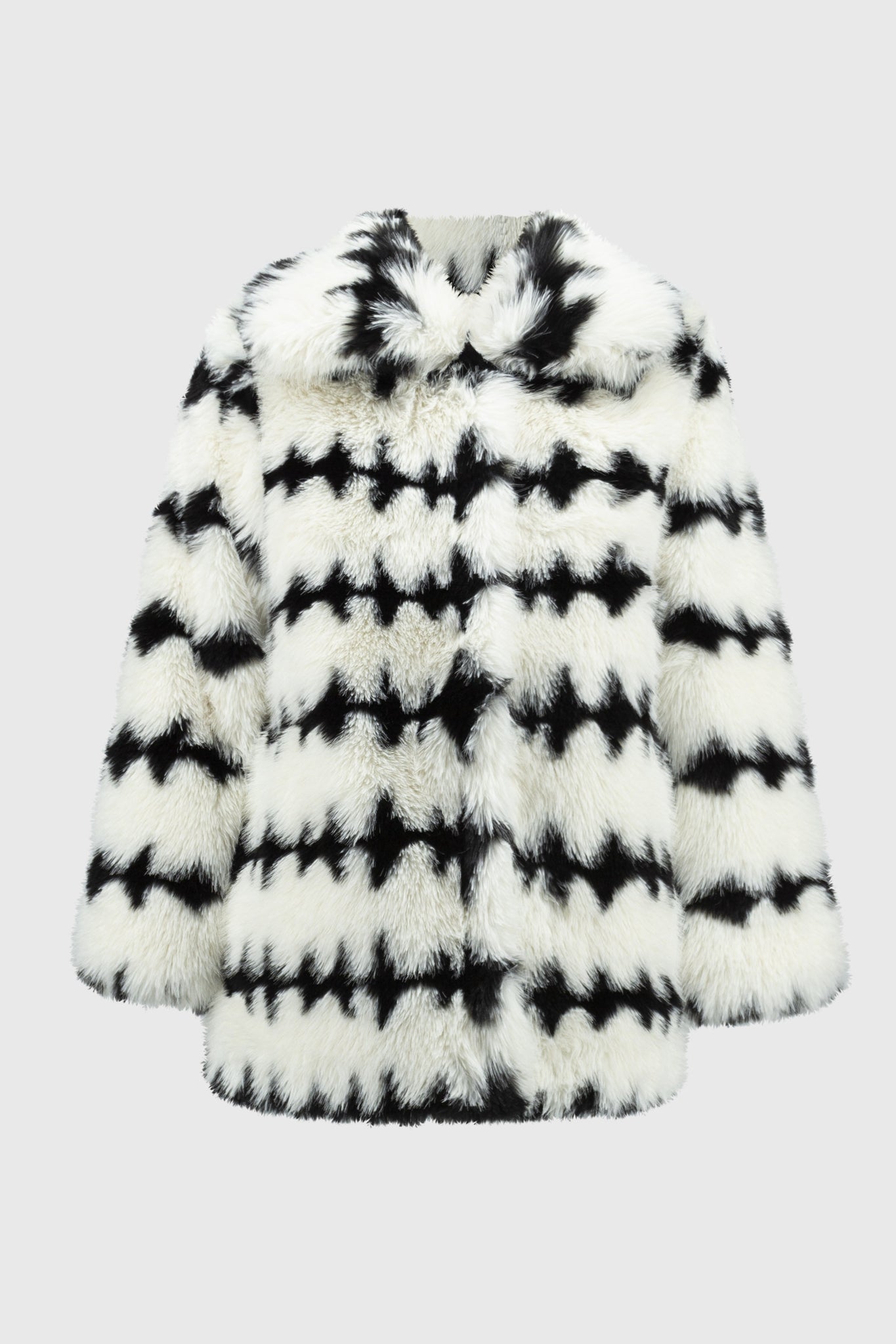 This reversible jacket combines plush faux fur with a captivating black and white geometric print for a touch of French sophistication. It's equipped with functional pockets and a buttoned closure, effortlessly blending avant-garde style with classic elegance in a sleek, compact design.