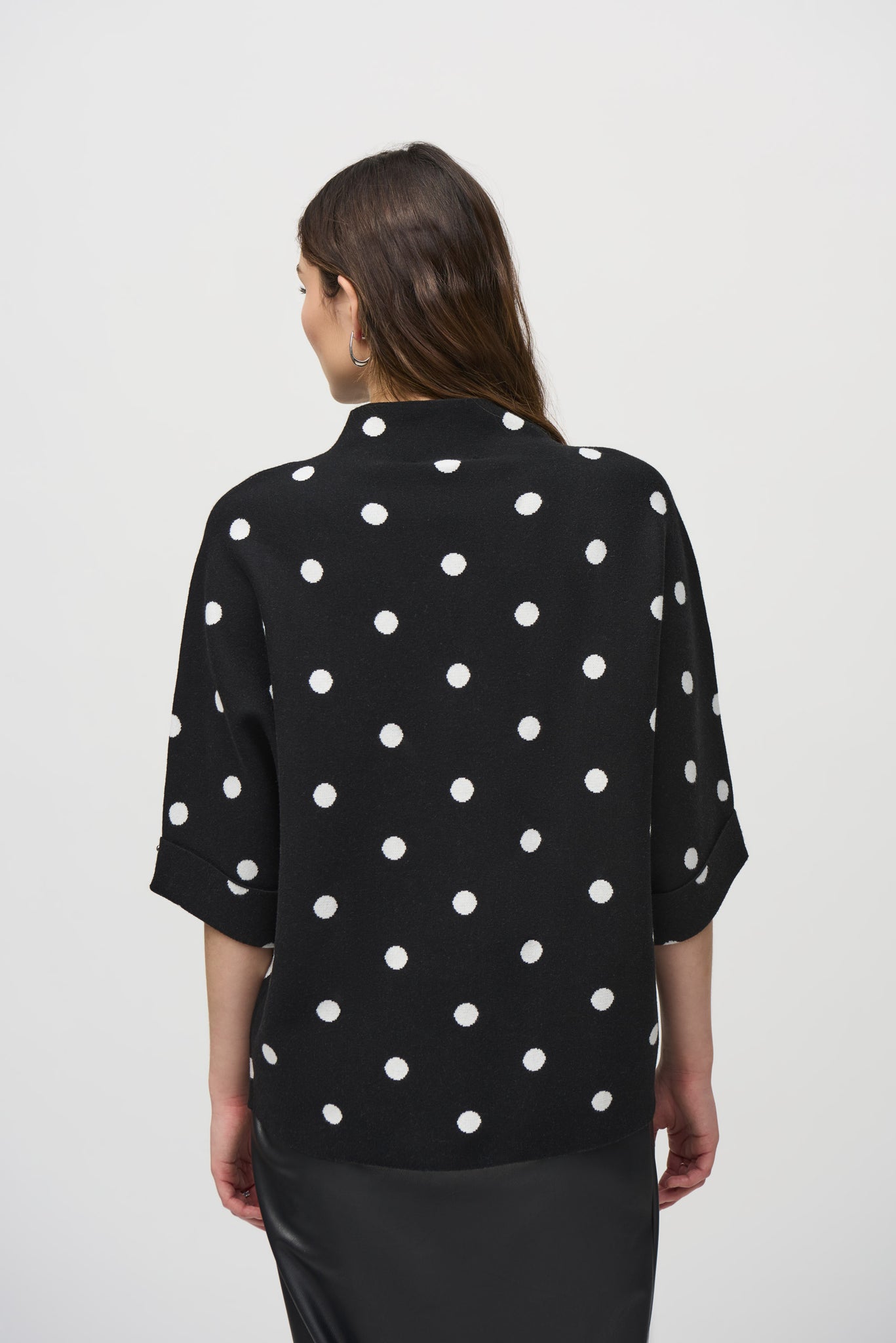 This pullover boasts a visually stunning two-tone dotted pattern. Crafted from luxurious jacquard sweater fabric, it features a sophisticated funnel neck and three-quarter sleeves adorned with rhinestone buttons.