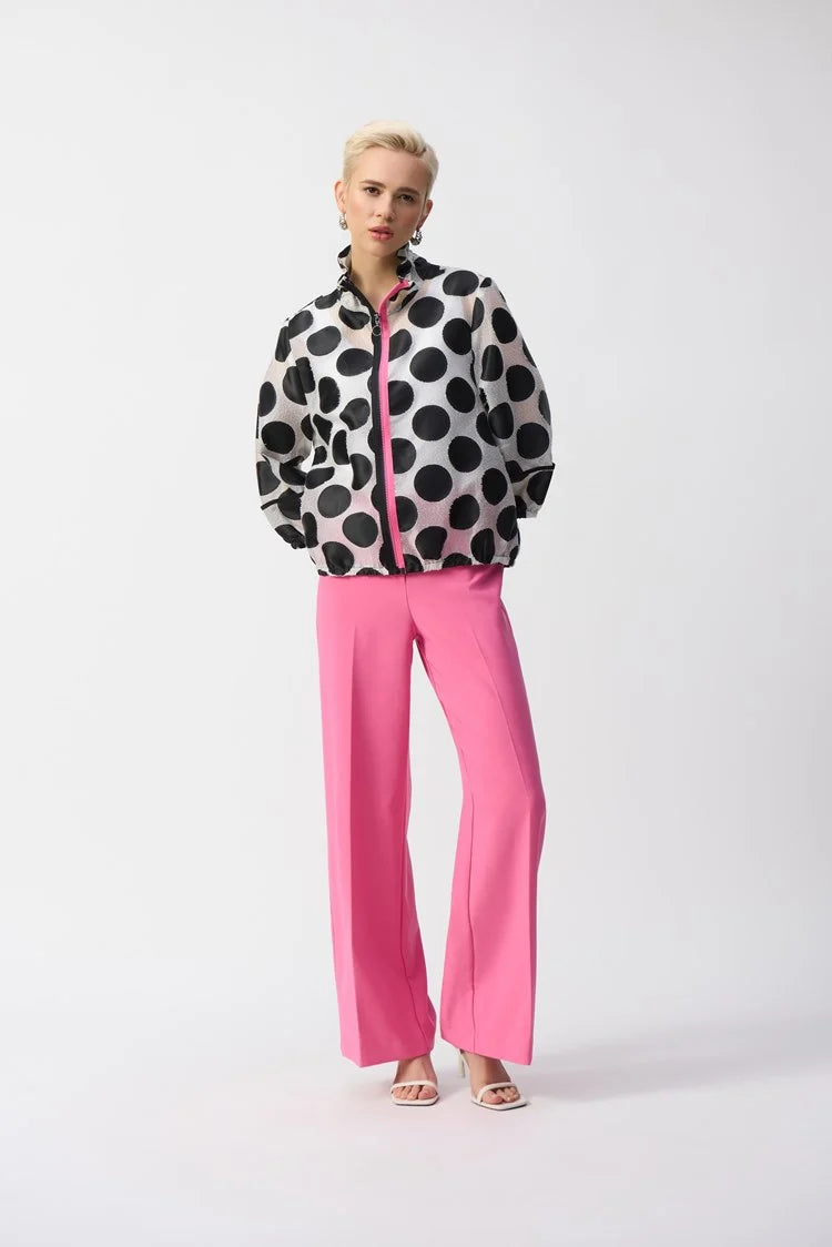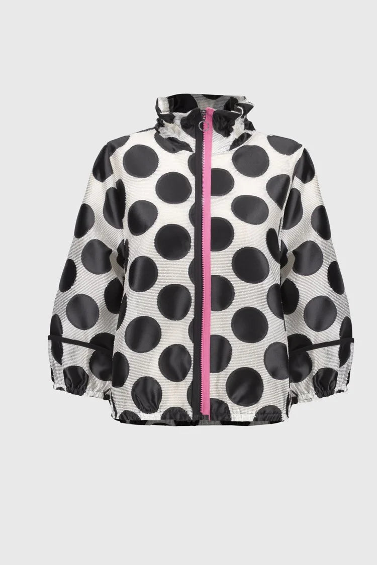 An exquisite display of artistic flair, this novelty jacquard jacket infuses instant style in any ensemble. The garment flaunts a striking dot print on a boxy silhouette that exudes bold confidence. The three-quarter puffed sleeves, shirred collar and front colour-blocked zipper closure work together beautifully to create this stunning piece.