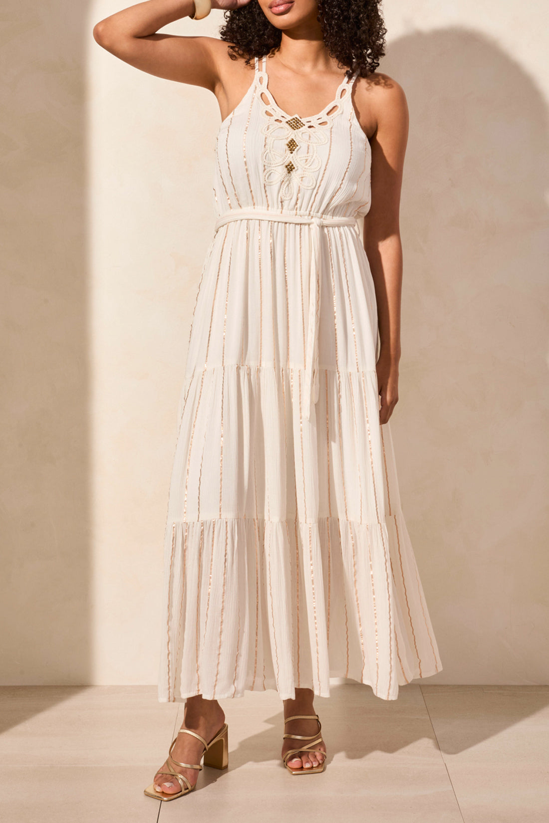 Feminine and romantic tiered dress with delicate detailing and gold embroidery running through the material.Perfect for a garden or beach wedding or a lazy afternoon bbq.