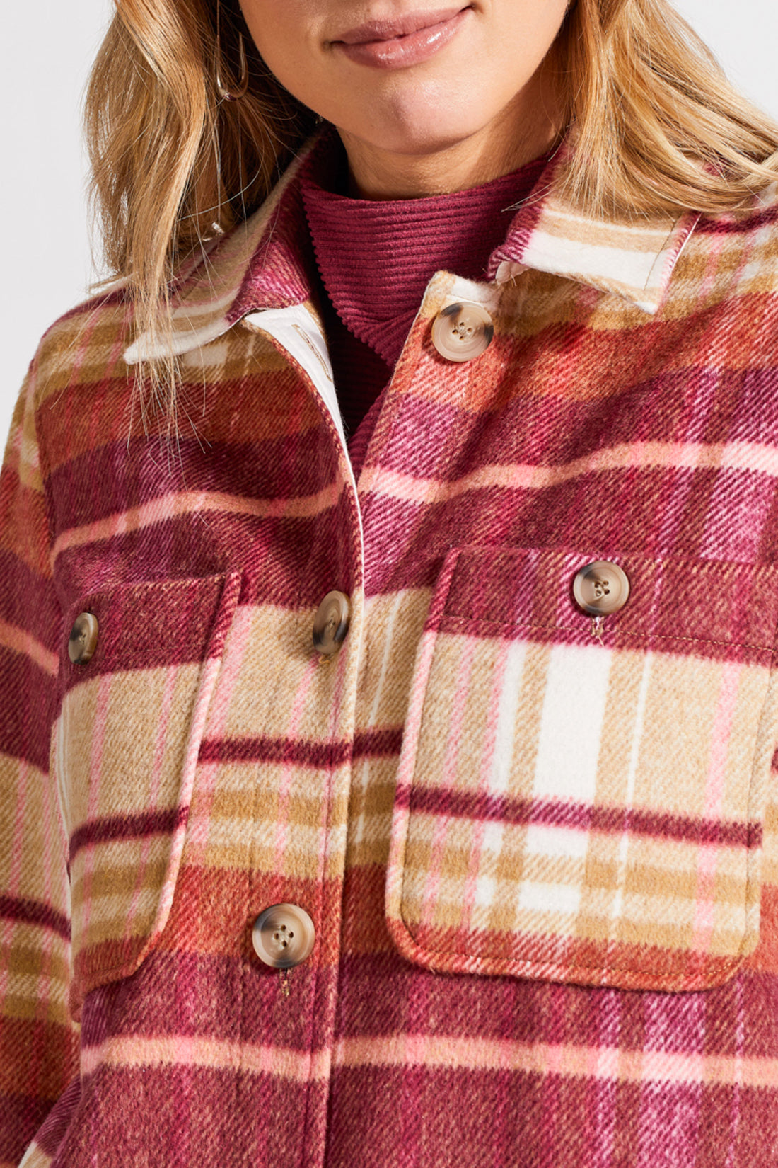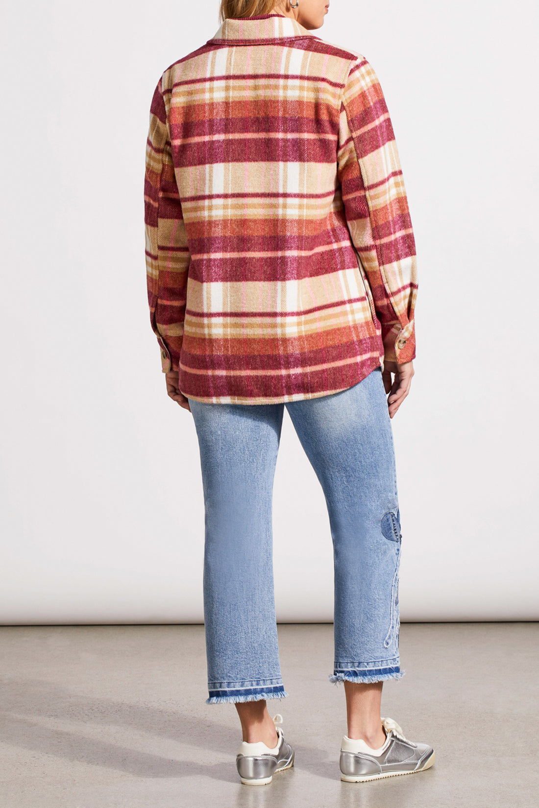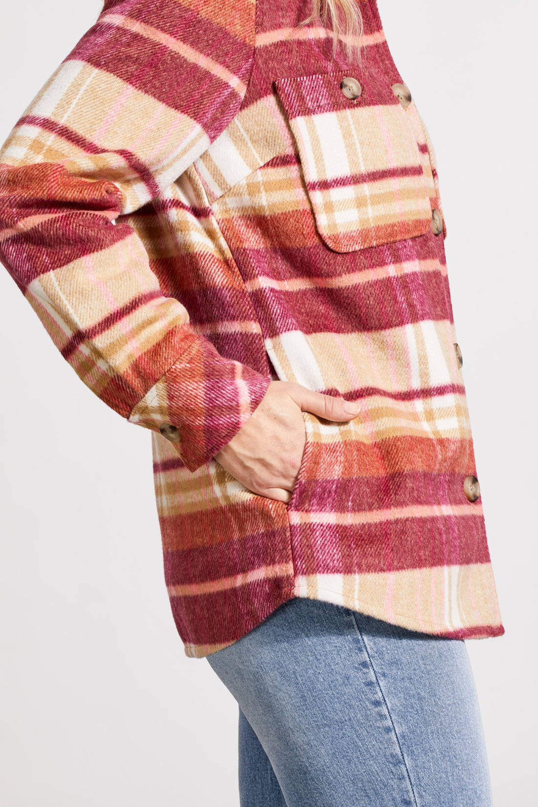 Plaid checkered shacket from Tribal sportswear...Soft and luxurious for those chilly days...Deep hues of rustic reds and golden tans..Deep side pockets and tiger eyes button is the perfect chic casual look.
