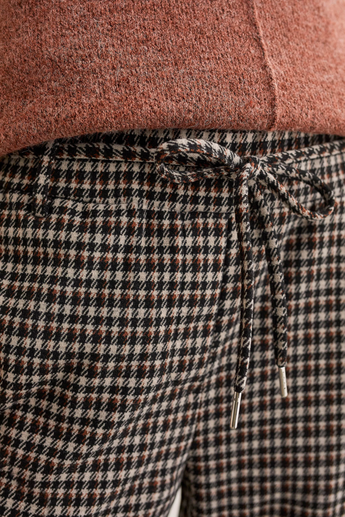 Front tie pant with drawstring waist in a hounds tooth print in black, cinnamon and ivory.